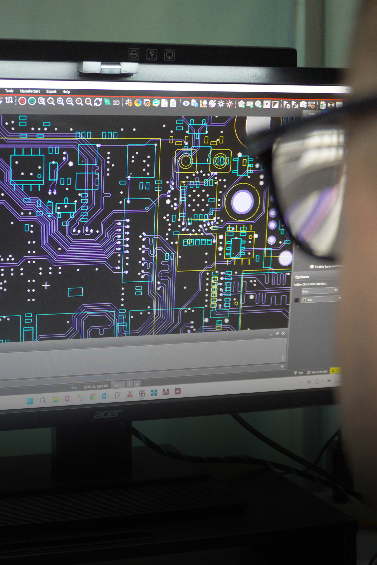 Close-up of a Digitax engineer reviewing a detailed PCB layout on a computer screen, showing complex circuit traces and components for advanced onboard electronic systems.