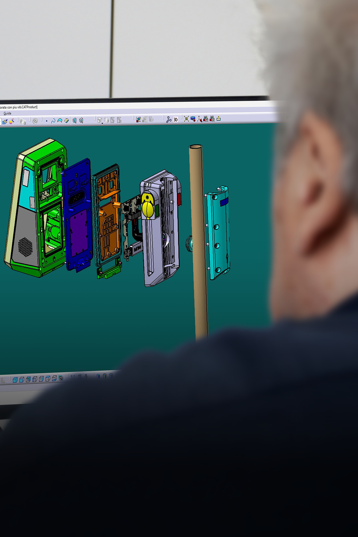 A Digitax engineer works on dual monitors on the exploded 3D model of ATOMO 7 smart Validator onboard device, reviewing electronic and mechanical components for advanced smart mobility solutions.